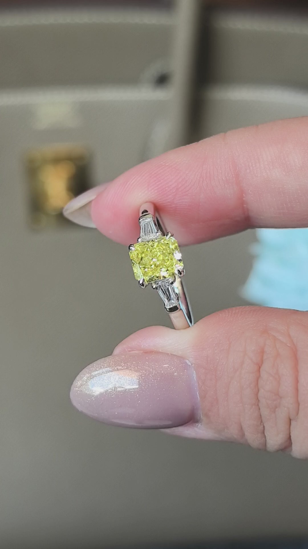 1.24ct 3.5g Cushion Vivid Yellow Lab Diamond Three-Stone Ring | Baguette Side Stones
