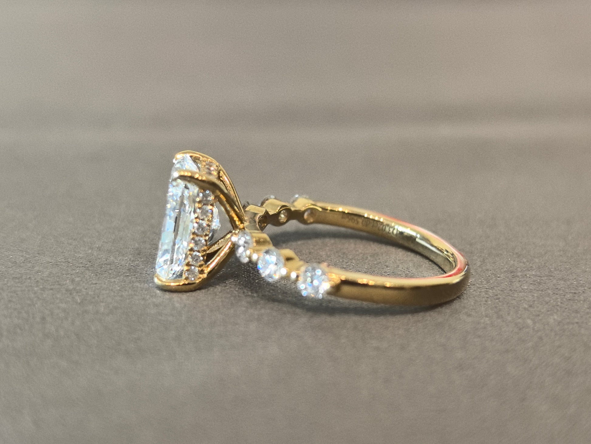 Flanking the main stone are six delicate round lab-grown diamonds, their classic shape complementing the radiant’s antique allure, each also IGI-certified to match the central gem’s quality.
