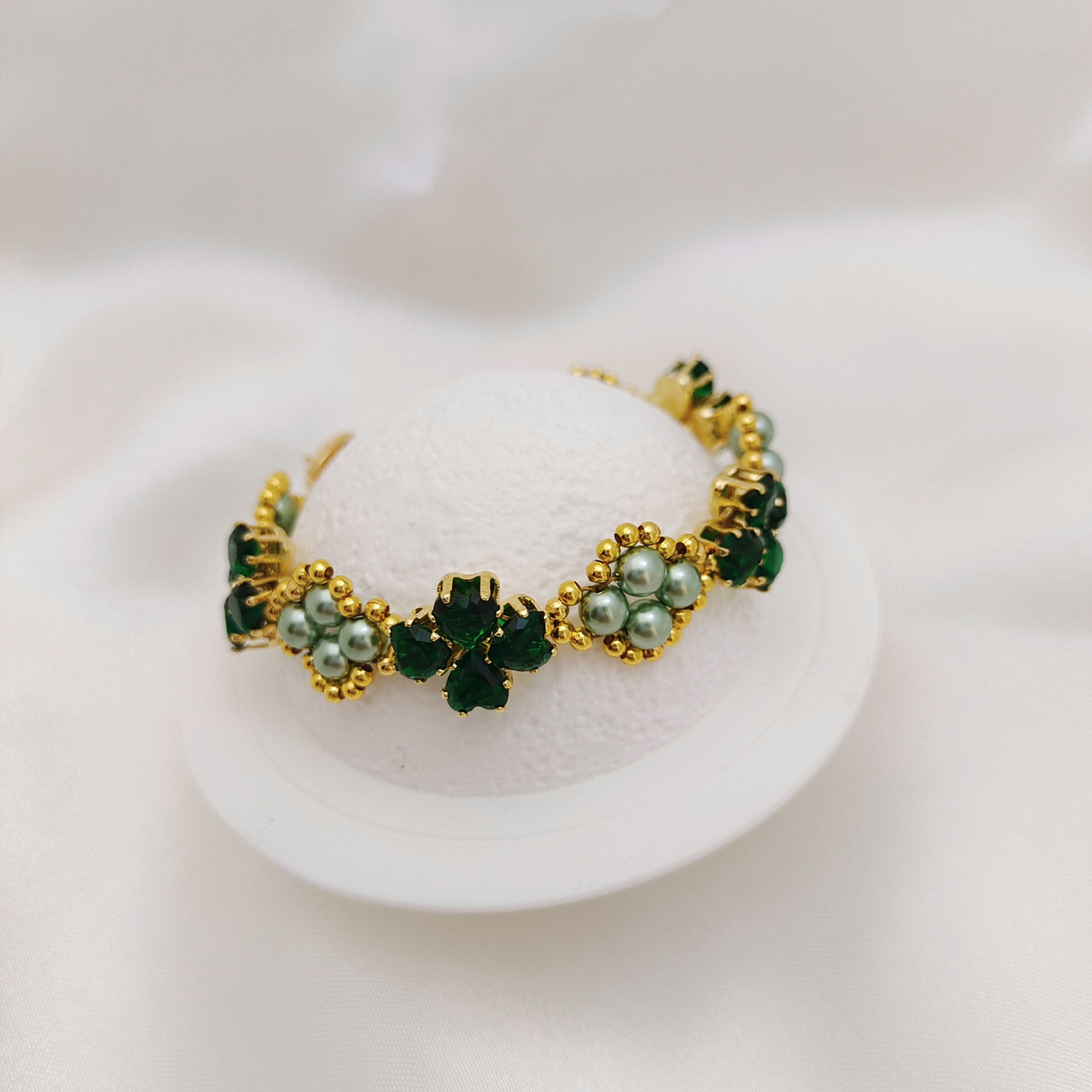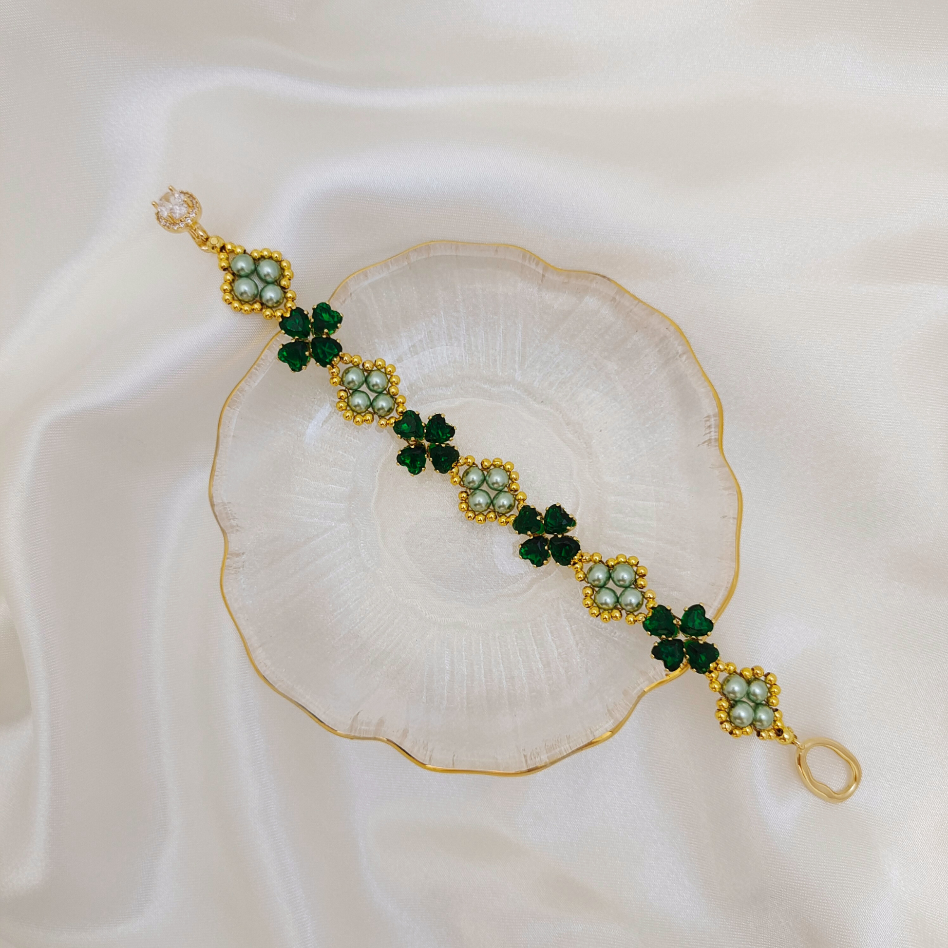 No.70 Clover Handmade Bracelet – Heart-Shaped CZ Charms, Pearls & Oval Clasp