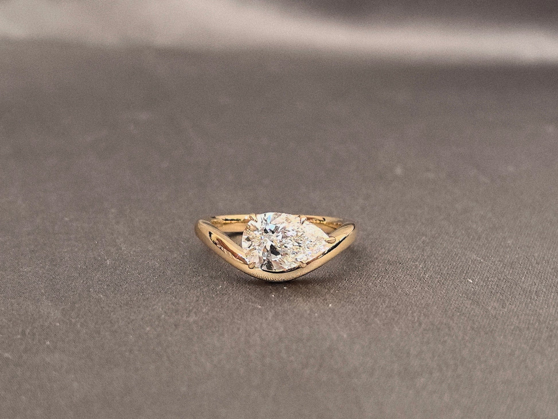 Redefine modern elegance with this artistically crafted east-west pear cut lab diamond ring. Designed to be worn horizontally on the finger, the pear-shaped lab diamond rests gracefully along the finger's curve, while the elegantly twisted band adds dynamic texture and movement. Specially proportioned for the pinky finger, this ring blends architectural design with ethical luxury, creating a subtle yet powerful statement for those who appreciate innovative jewelry with meaning.