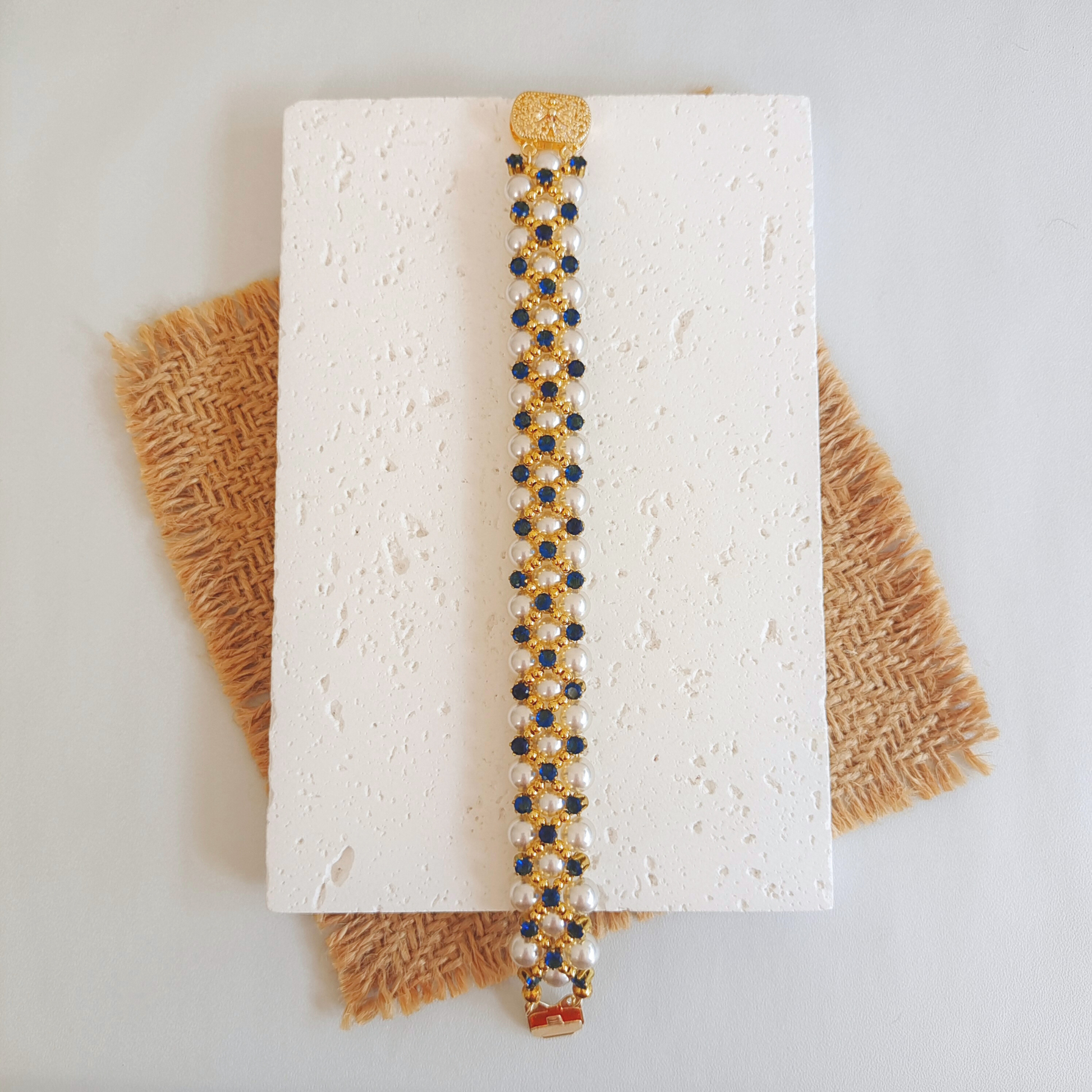 No.45 Handmade Beaded Bracelet – Blue Phantom Design with Pearl & Gold Accents