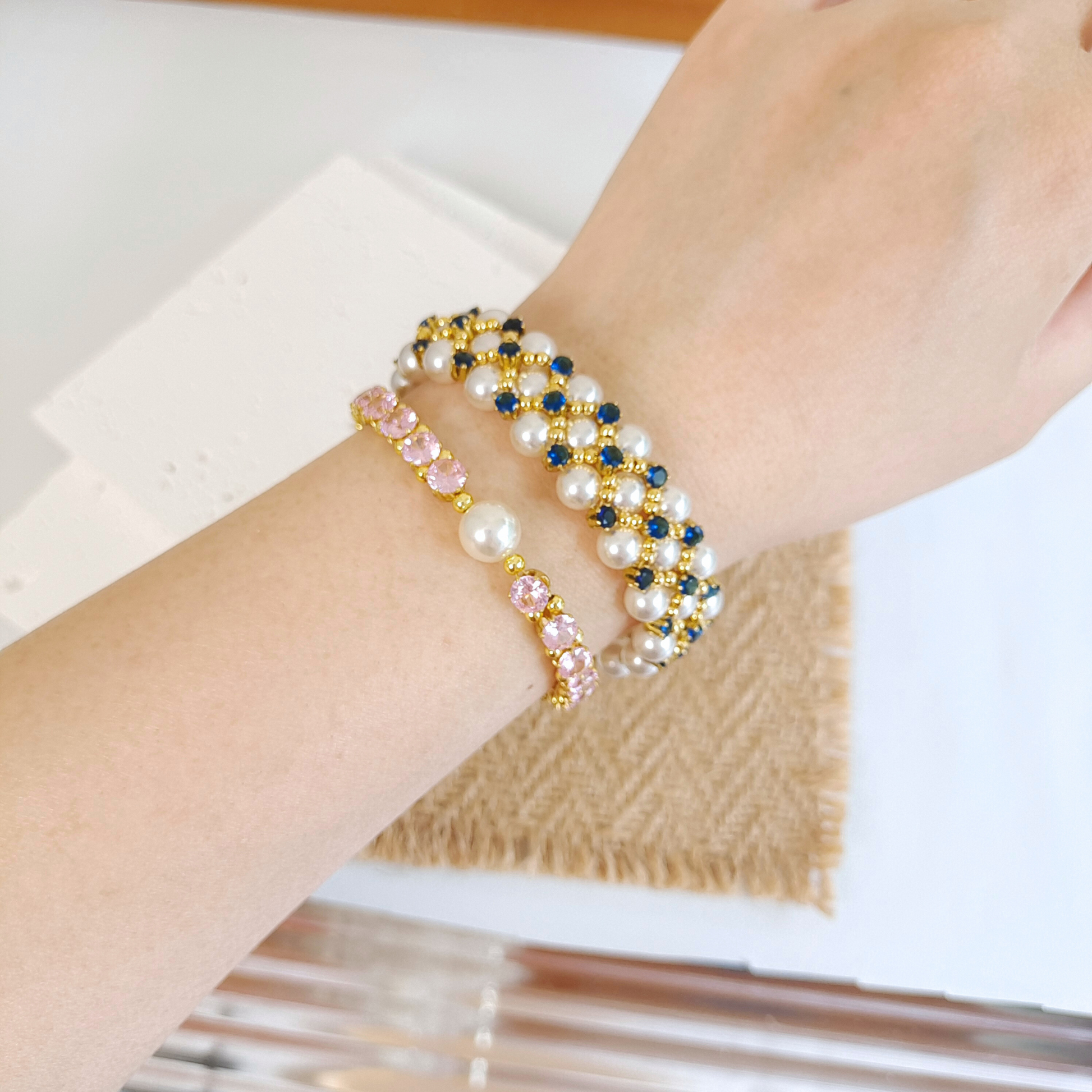 This handcrafted bracelet features a mesmerizing mix of 6mm pearls, sapphire blue zircon beads, and shimmering golden seed beads.
