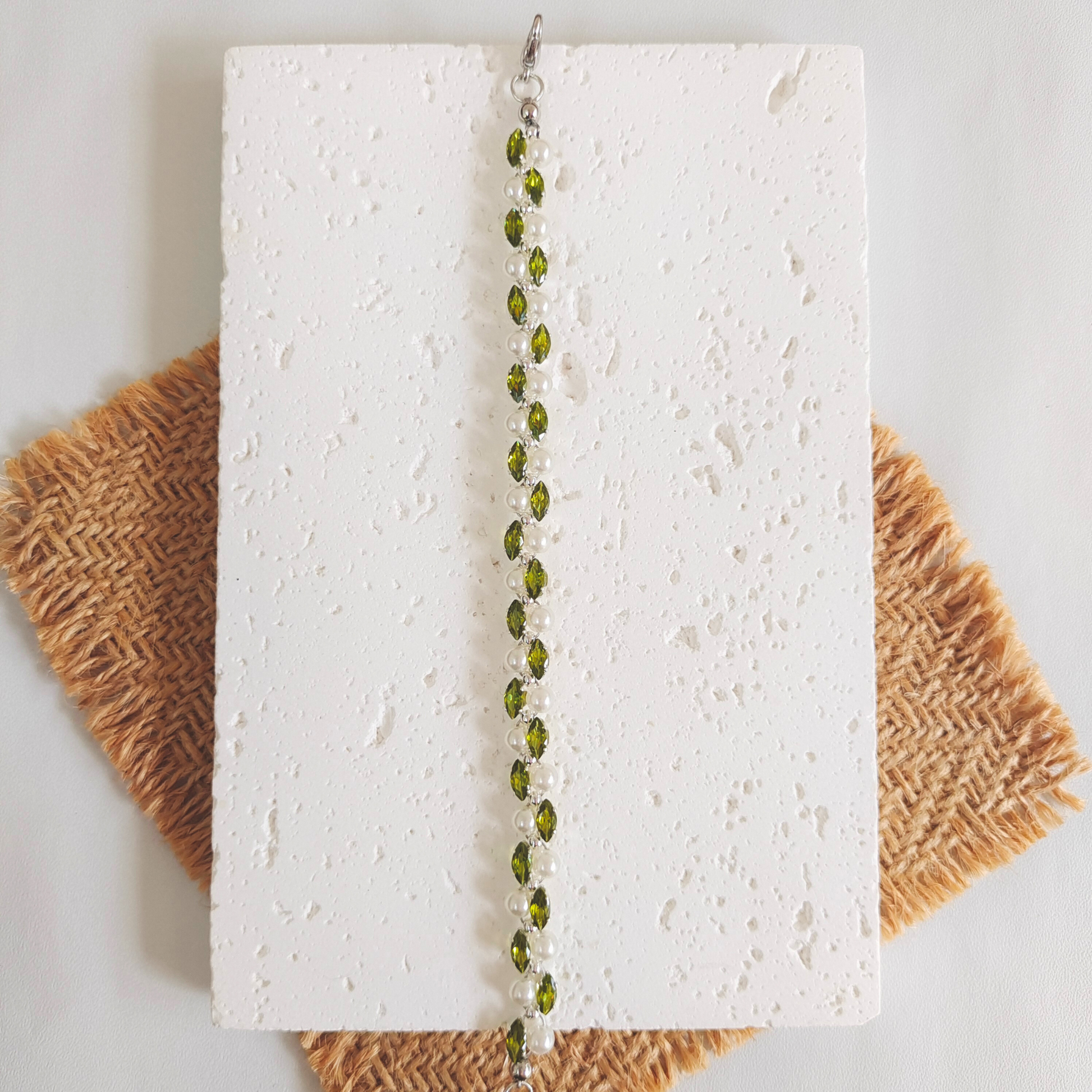 This elegant handmade bracelet features olive green marquise-cut rhinestones, 4mm imitation Swarovski pearls, and silver seed beads for a fresh, botanical look. Finished with a lobster clasp and jump rings, it's a refined piece of jewelry perfect for daily wear or gifting.