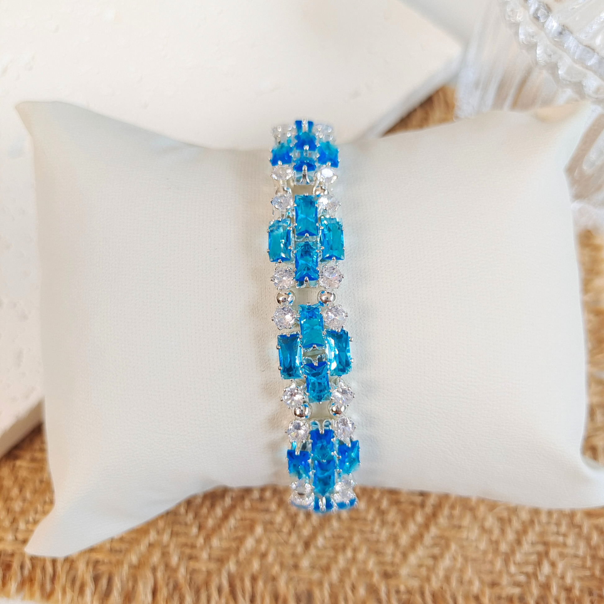 A stunning handcrafted bracelet featuring 2.5×5mm blue baguette-cut zircon stones, sparkling 3mm white zircon beads, and silver seed beads. This icy blue design, inspired by the charm of summer skies and cool waters, is completed with an elegant oval zircon clasp. A refreshing and elegant accessory for daily wear or special occasions.