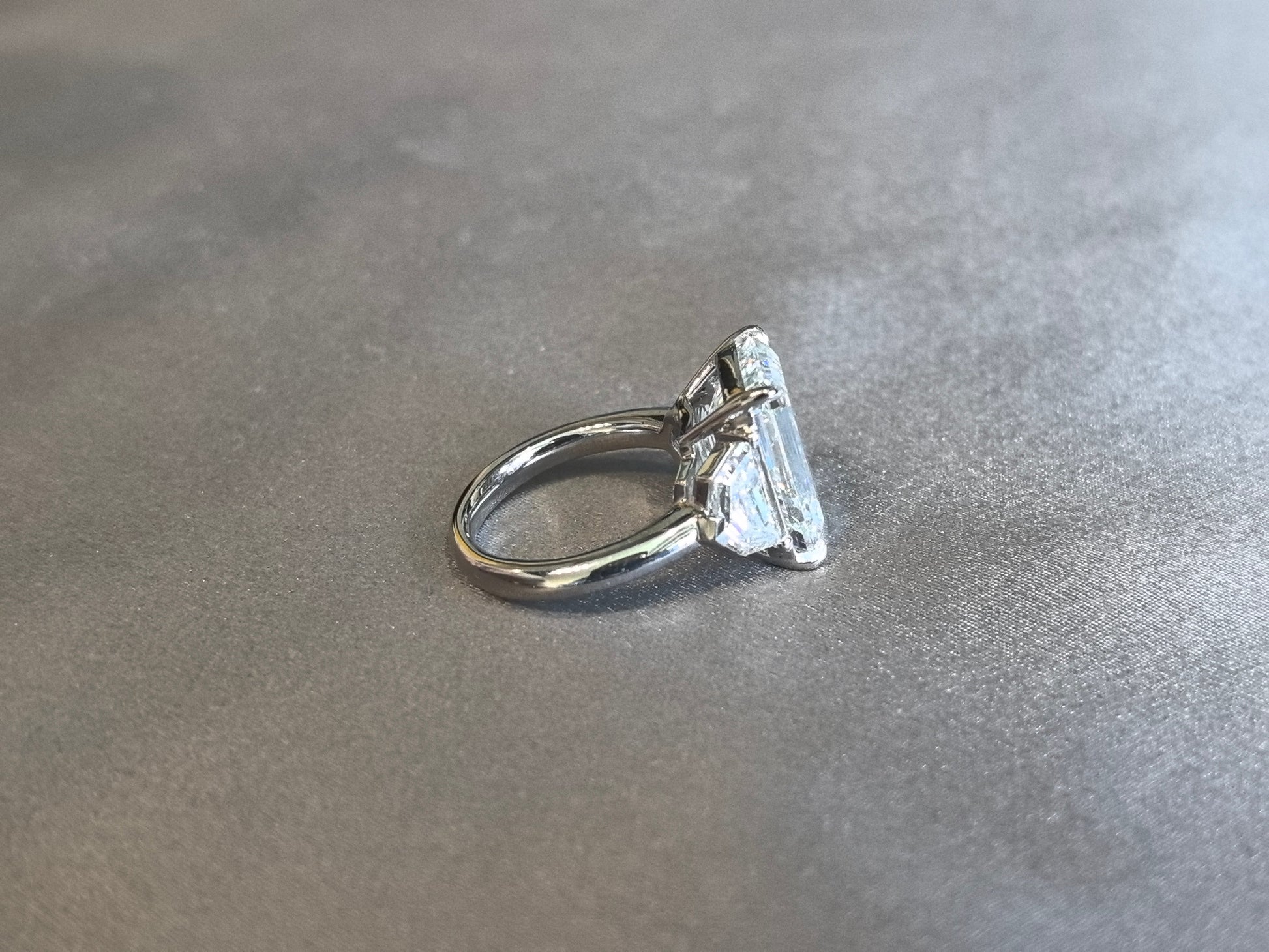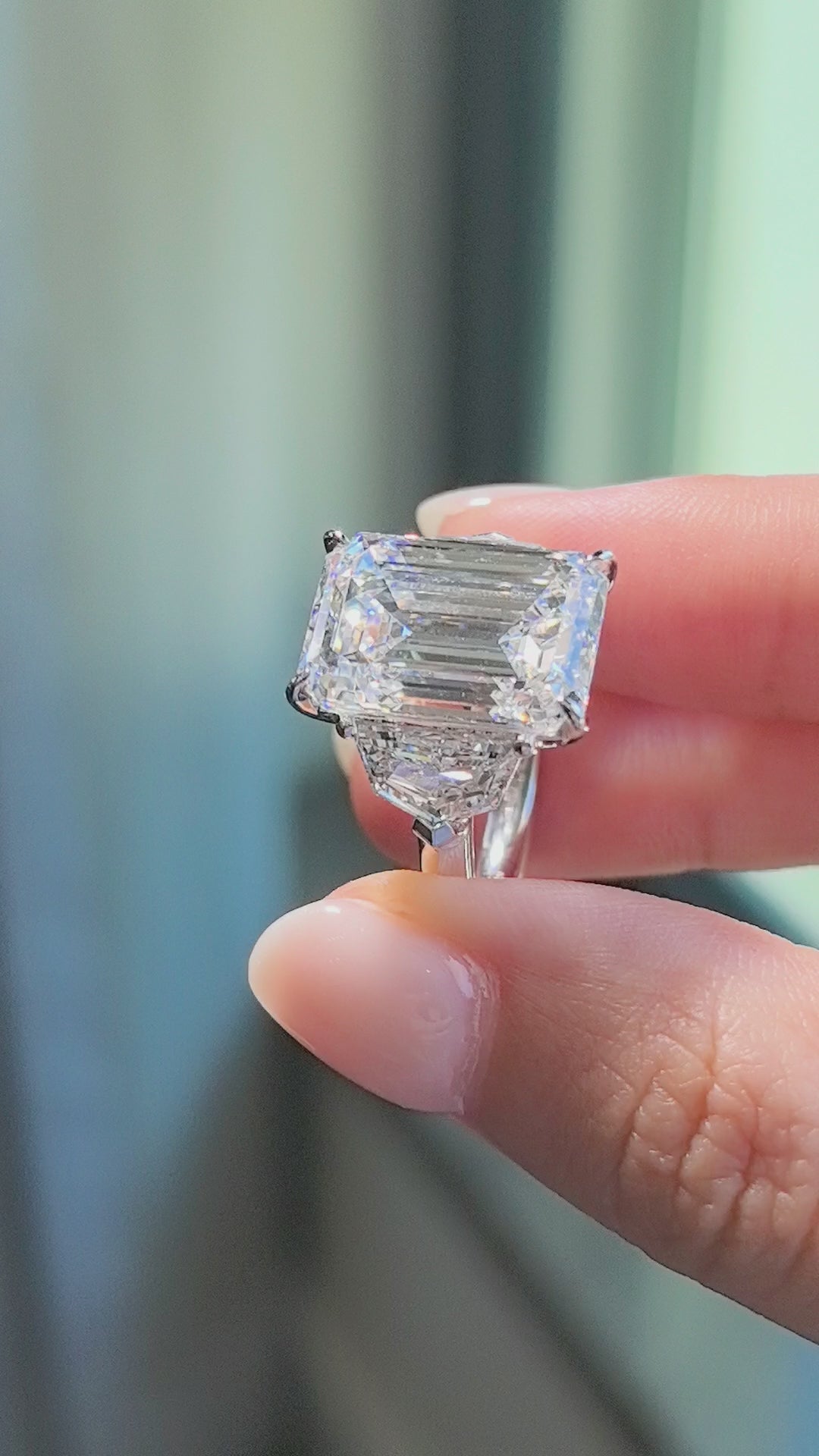 A ring that tells a story. This magnificent three-stone ring features a stately emerald cut lab-grown diamond at its center, flanked by two brilliant trillion-cut diamonds. A design rich with symbolism and Art Deco inspiration, it represents your shared past, vibrant present, and bright future together, all wrapped in unparalleled elegance.
