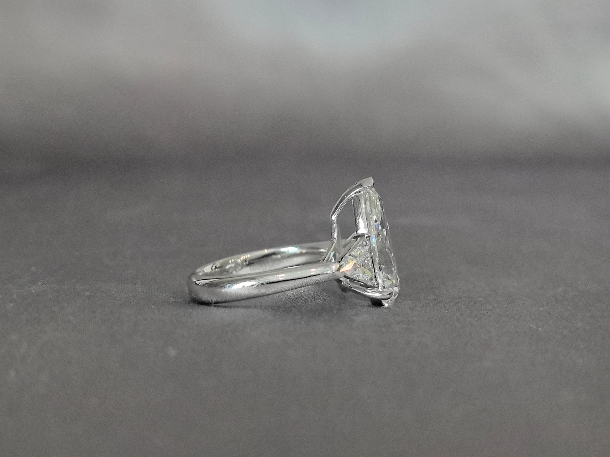 A captivating symphony of curves and angles. This distinctive trilogy ring features a graceful pear-cut lab-grown diamond at its center, known for its elegant teardrop silhouette. It is dynamically flanked by two trillion-cut lab-grown diamonds, whose unique triangular shapes add brilliant sparkle and a striking geometric contrast. This masterful combination creates a piece that is both soft and structural, flowing with artistic harmony.