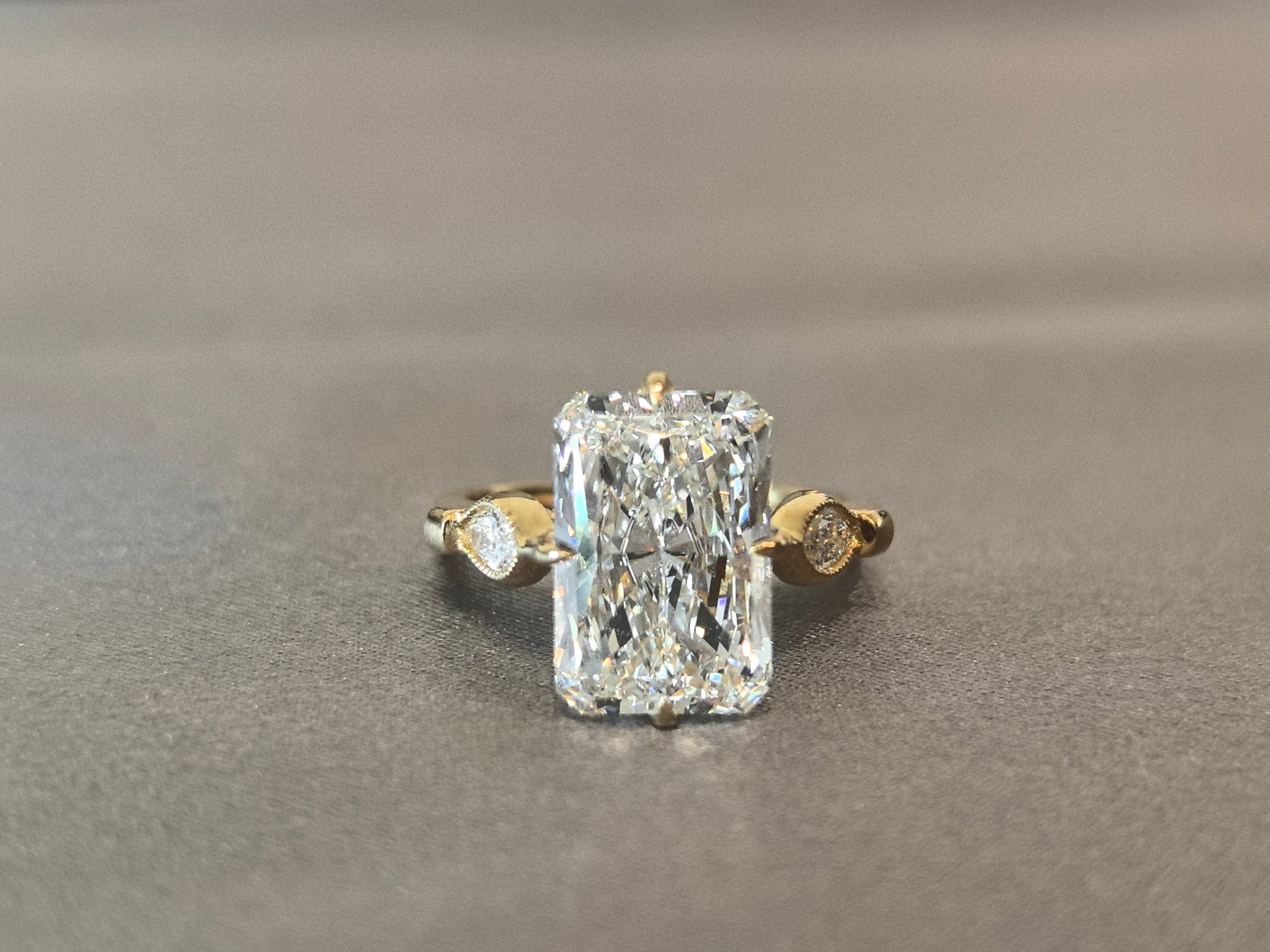 This striking Radiant-Center Ring with Marquise Sidestones features a brilliant radiant-cut lab-grown diamond at its core—IGI-certified with F color, VS2 clarity, and an Excellent cut that blends bold sparkle with soft, vintage-inspired facets.