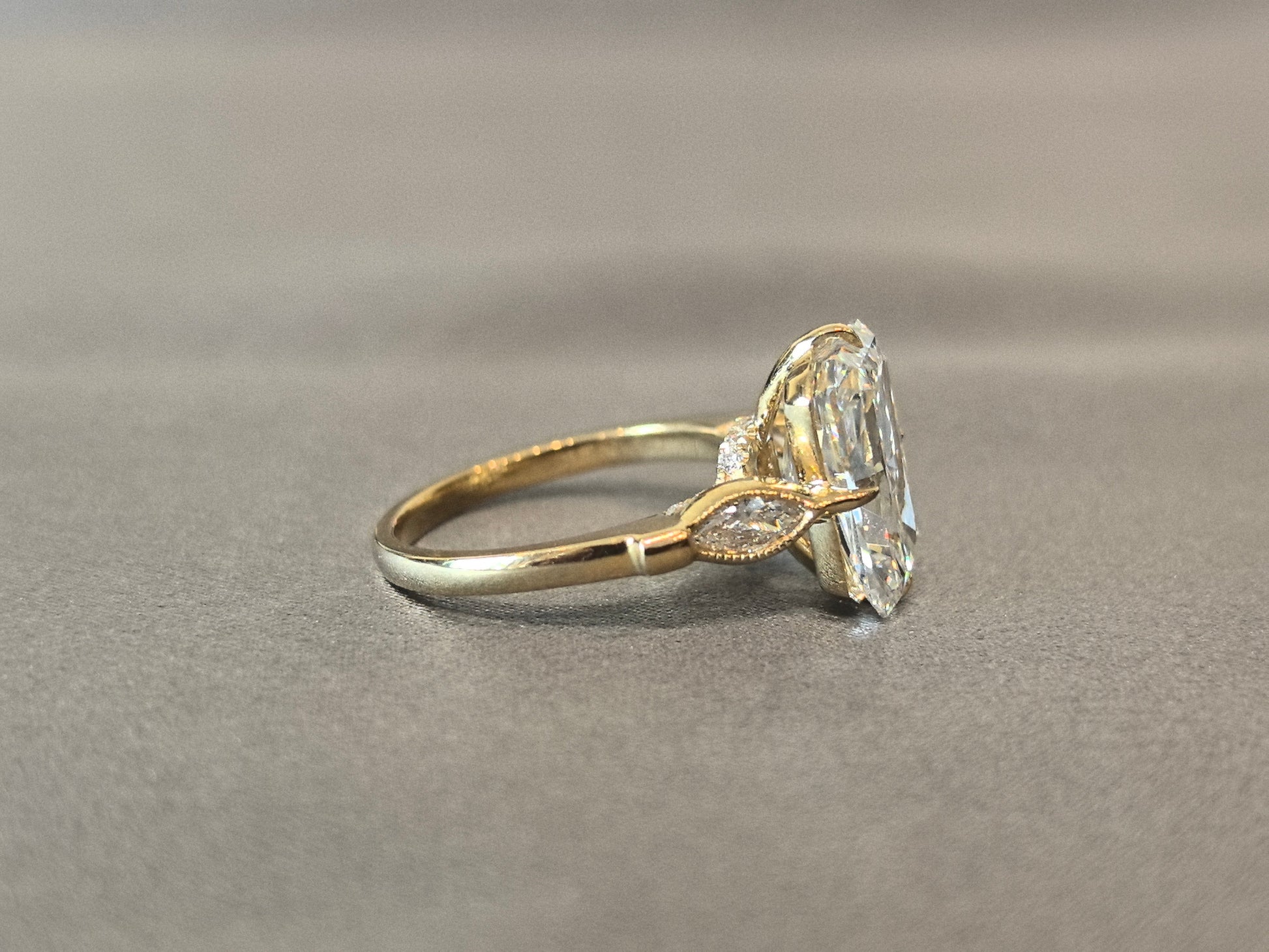 Flanking the main stone are two elegant marquise-cut lab-grown diamonds, their elongated, curved shape creating a graceful frame that enhances the radiant’s allure, each sidestone also IGI-certified to match the central gem’s exceptional quality.