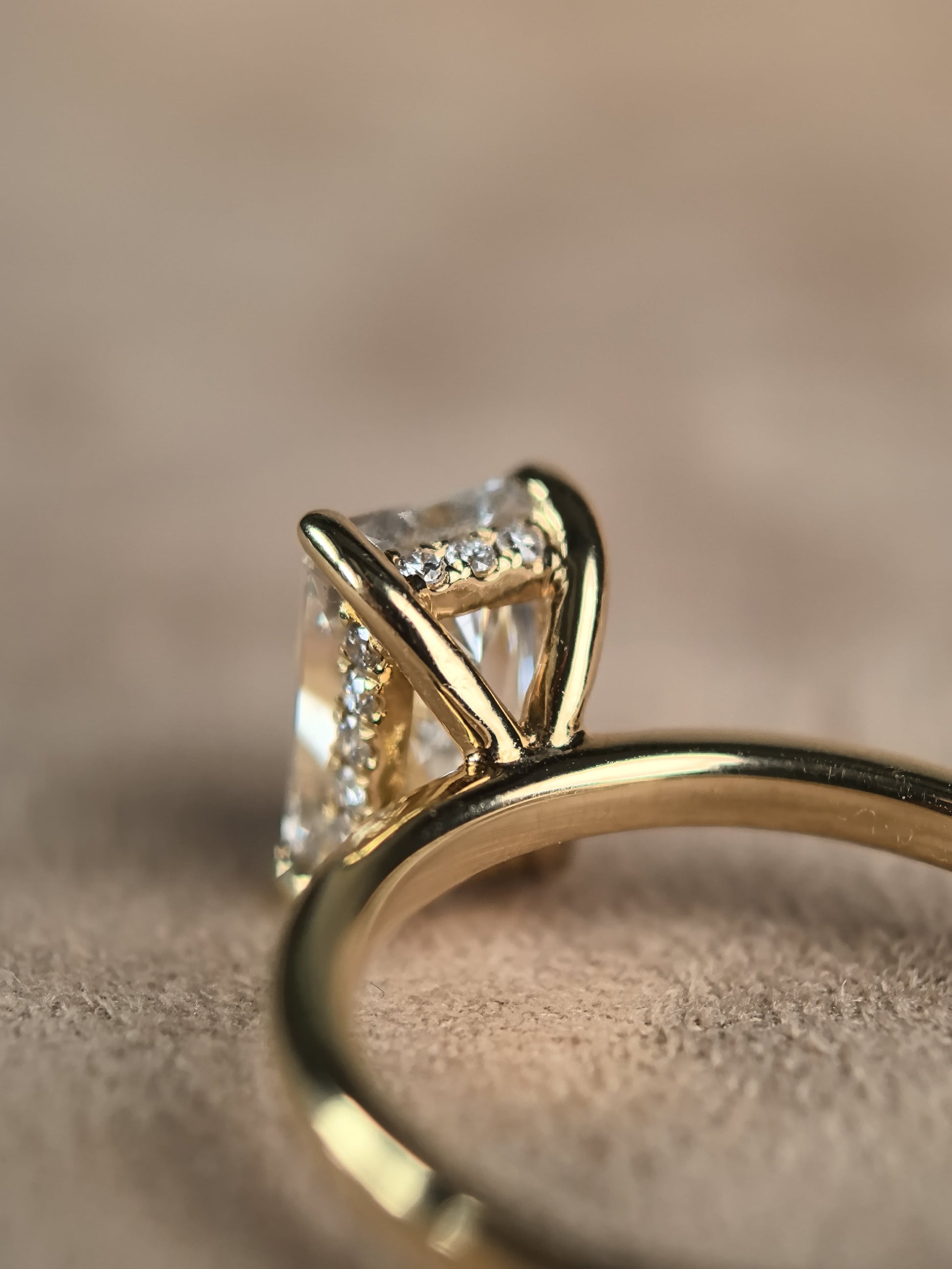 Pure sophistication, brilliantly reimagined. This minimalist ring features a stunning radiant-cut lab-grown diamond at its center, celebrated for its brilliant faceting and clean lines. Tucked discreetly beneath the stone, a hidden halo of lab-grown diamonds adds a surprising and modern burst of sparkle, elevating the classic solitaire into a statement of understated, contemporary luxury.