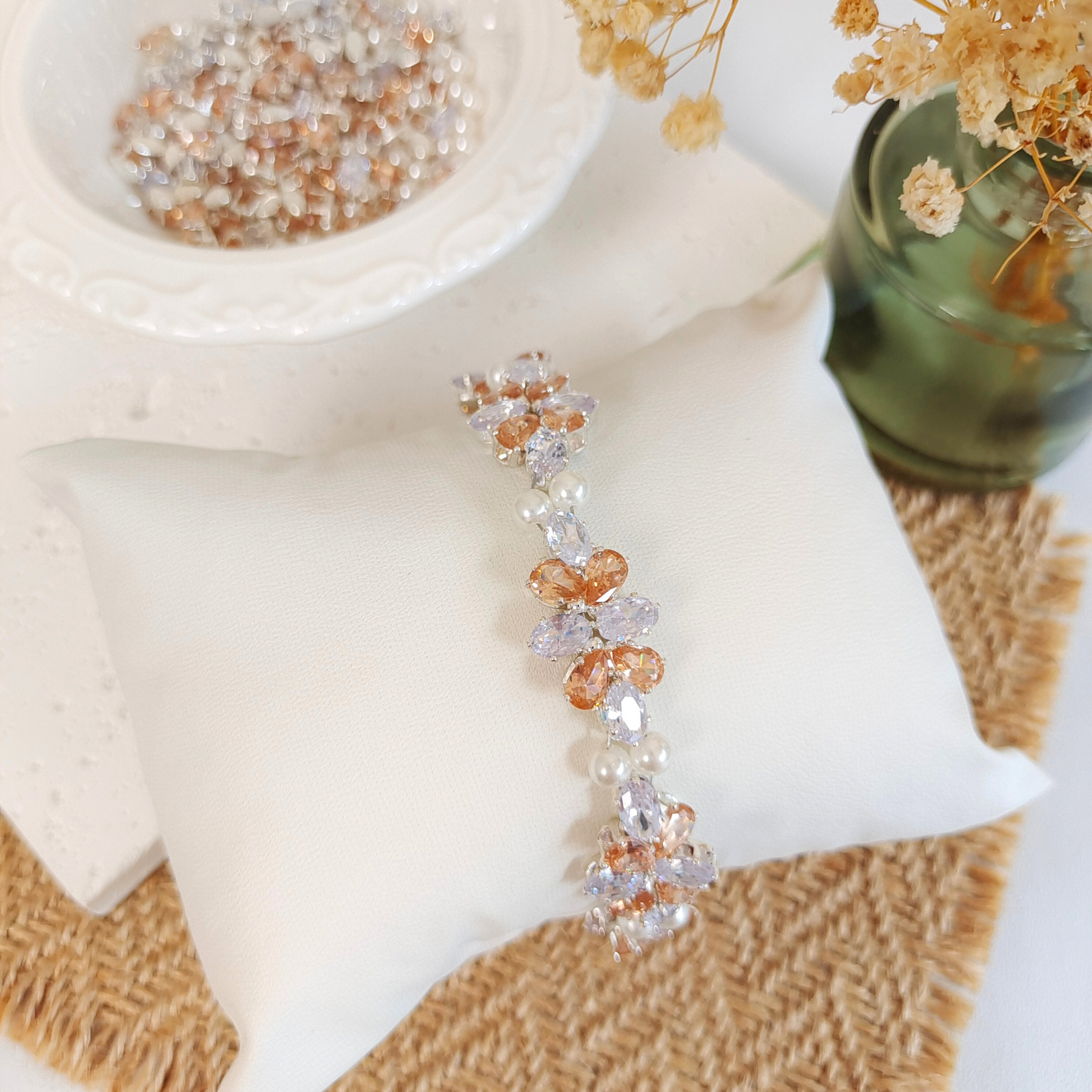 No.28 Serene GemPearl Handmade Bracelet – Clear Oval CZ, Amber Teardrops & Pearls