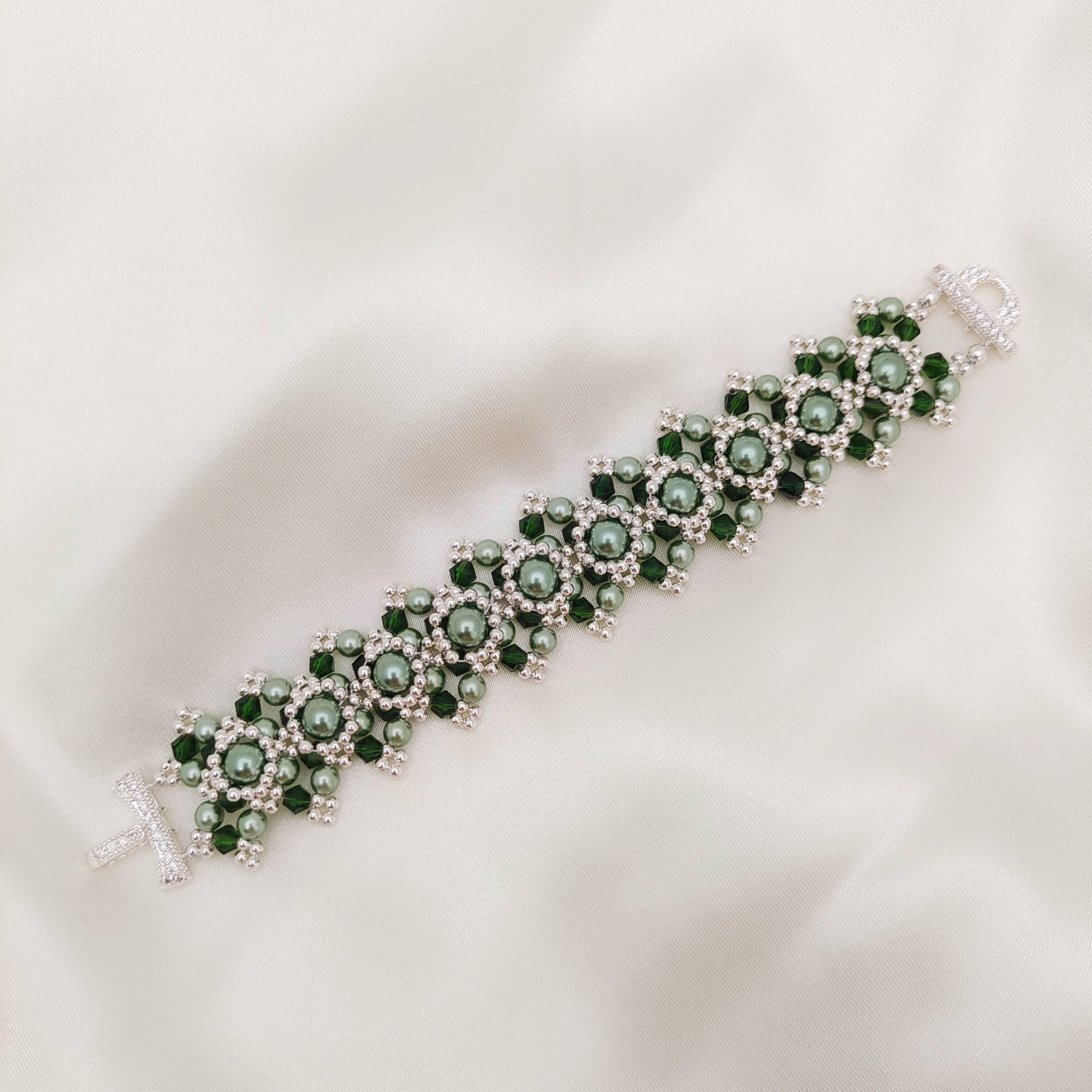 No.53 Vintage Peacock Green Handmade Bracelet | Pearl & Crystal | Finished Jewelry